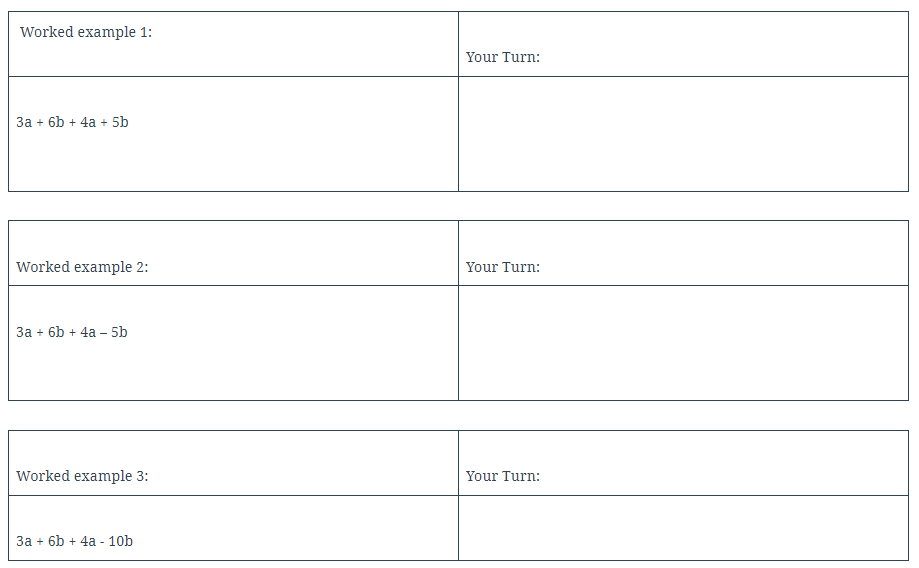 1. Split the white/blackboard in two (headed Worked Example and Your Turn)
